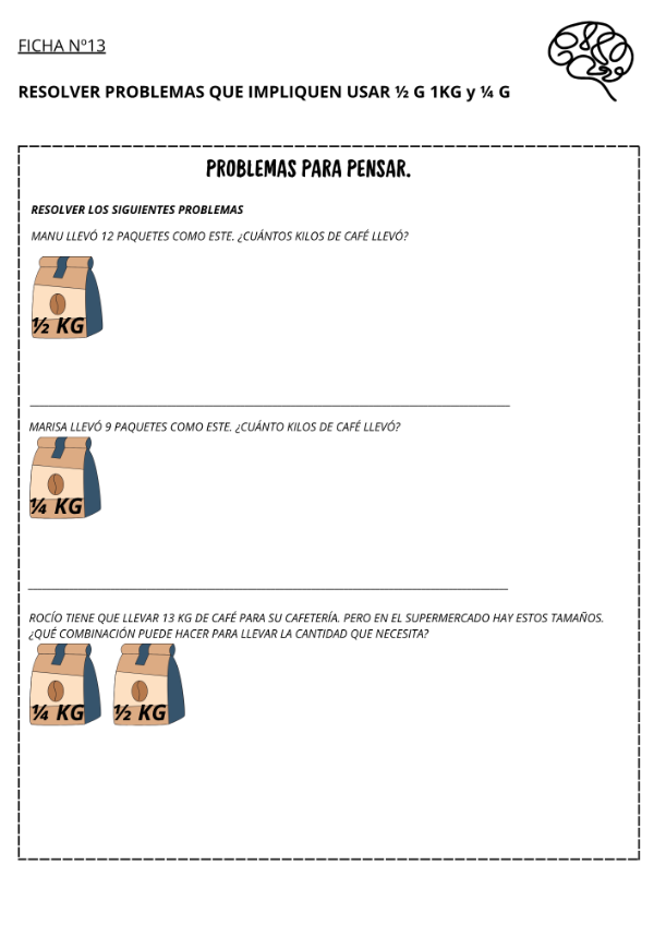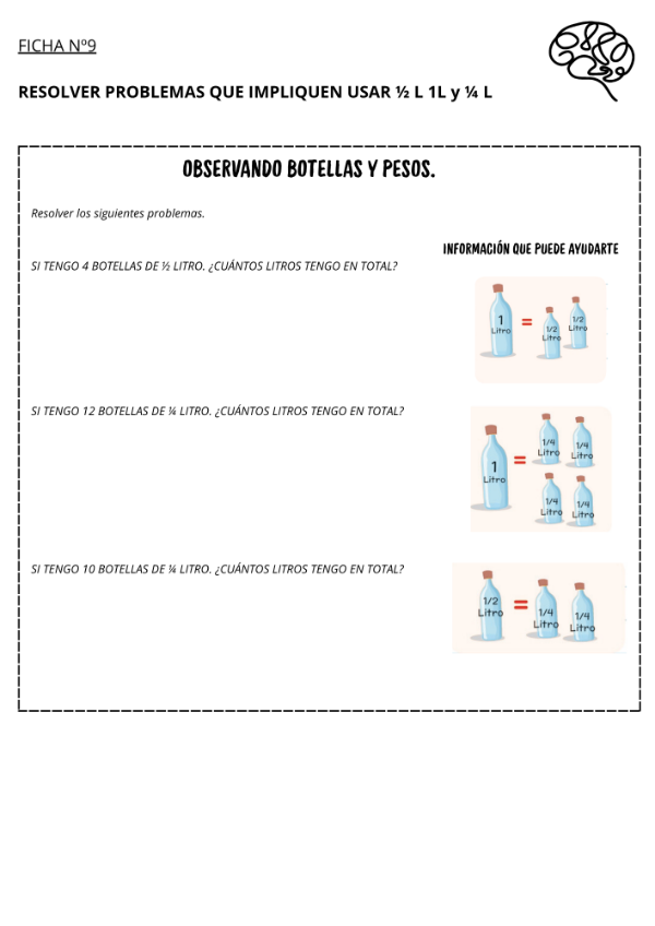 🔹 Actividades sobre medio, entero y cuarto en relación a gramos y litros.