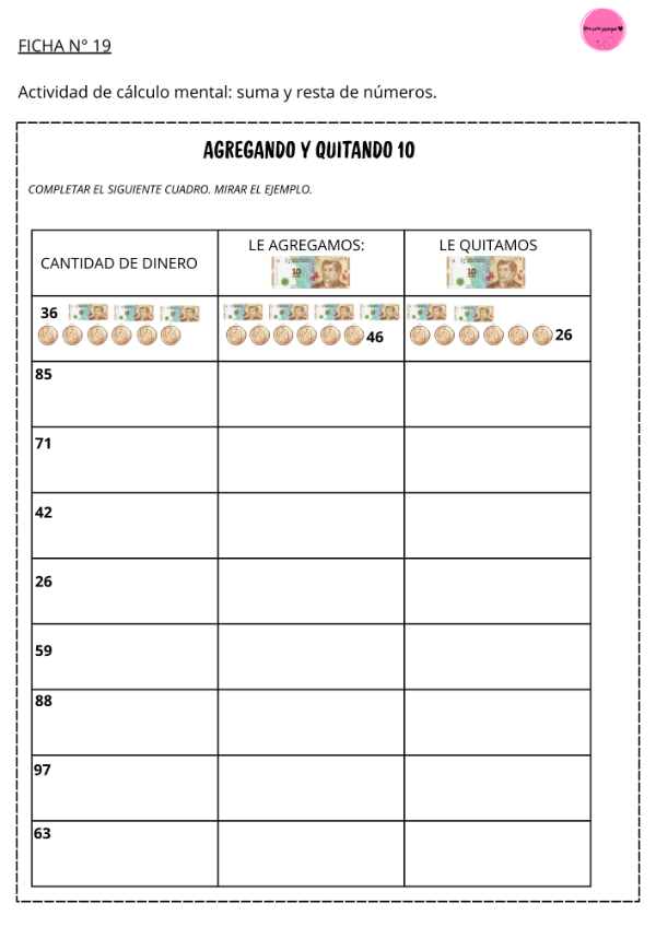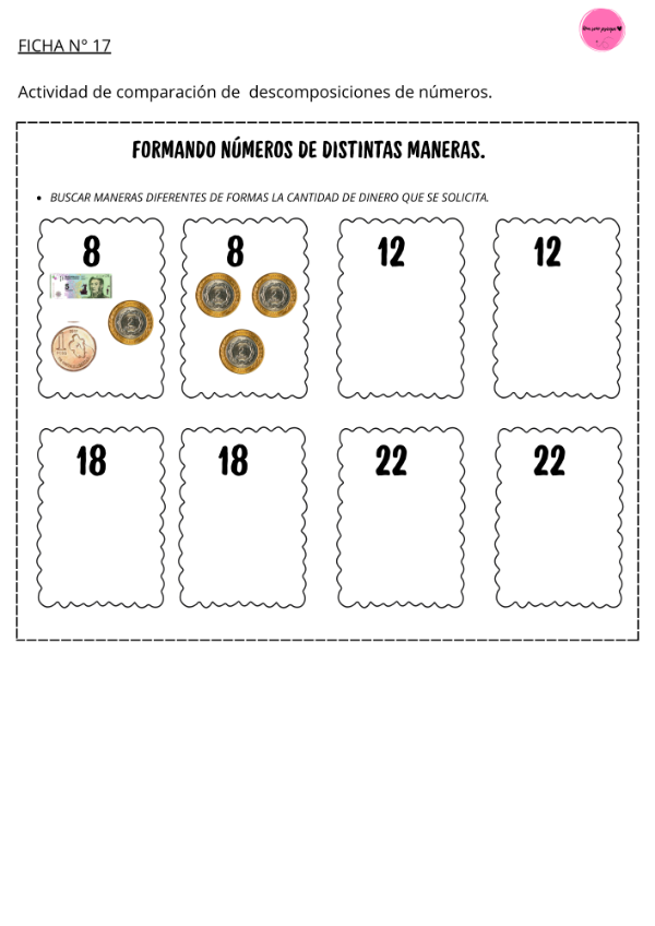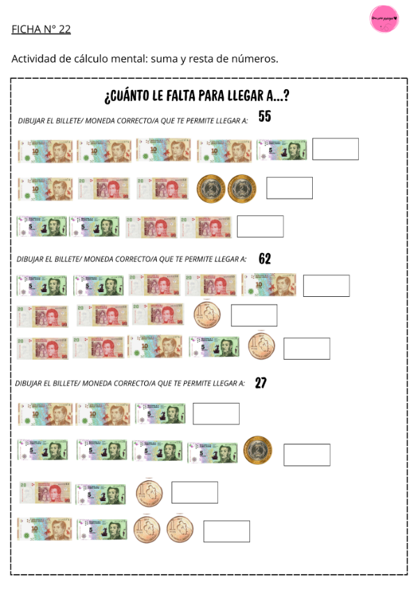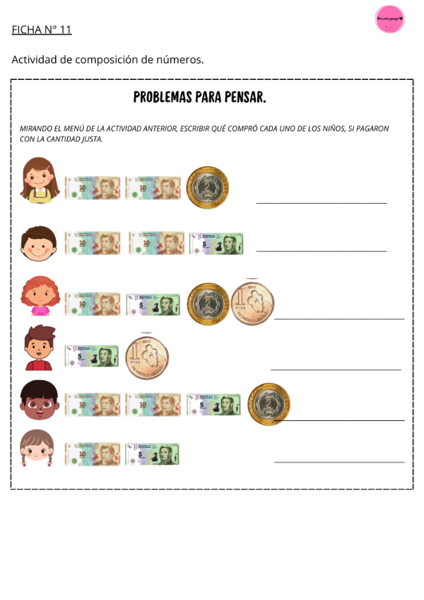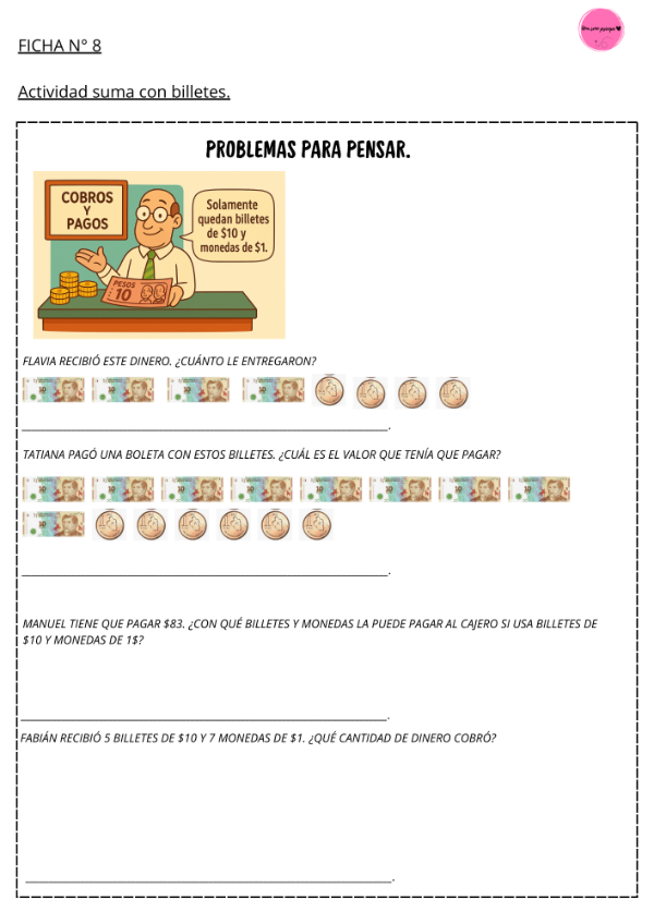 Este recurso contiene 25 fichas en formato PDF, en imprenta mayúscula, diseñadas para favorecer el trabajo con dinero en situaciones cotidianas de manera lúdica y significativa.