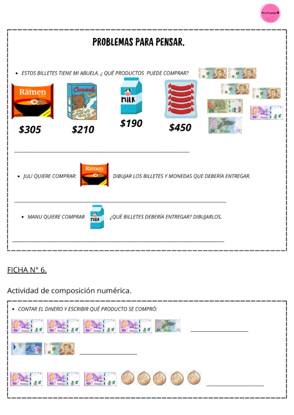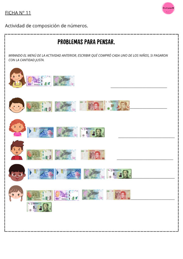 Este material propone trabajar la descomposición numérica a partir del uso de billetes y monedas, brindando a los estudiantes la posibilidad de reflexionar y afianzar la comprensión del valor posicional.