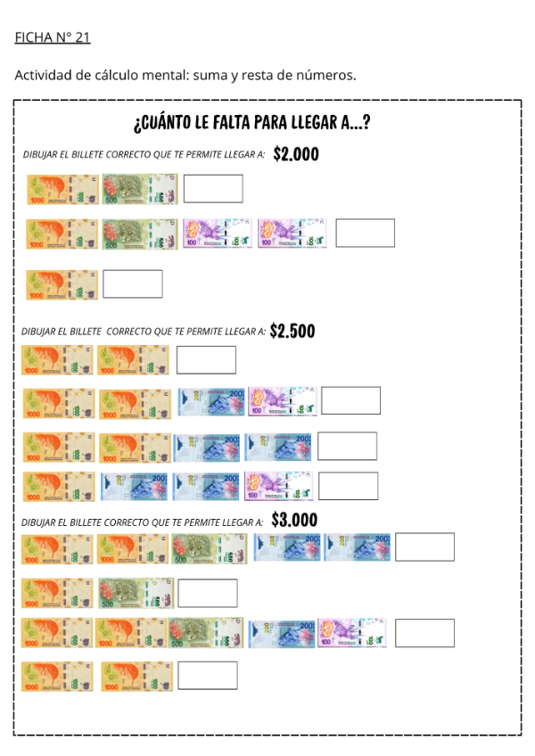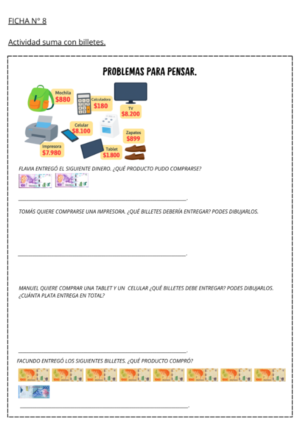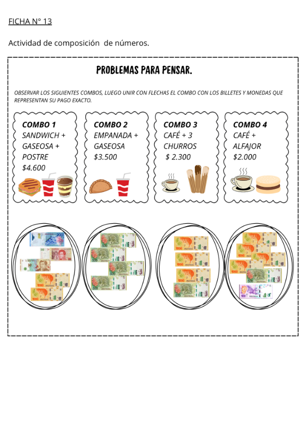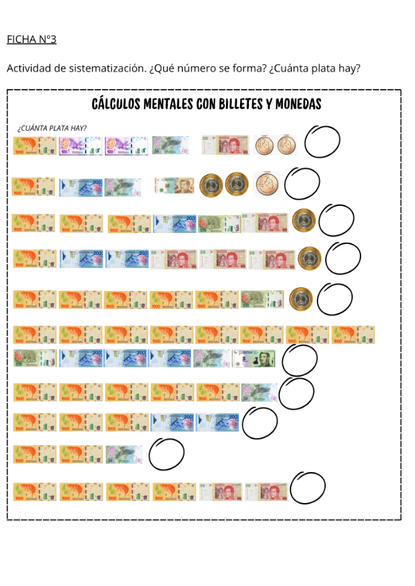 Este material propone 25 actividades diseñadas para trabajar la descomposición numérica de los unos, dieces, cienes y miles, a través de situaciones problemáticas contextualizadas en el uso de billetes y monedas.